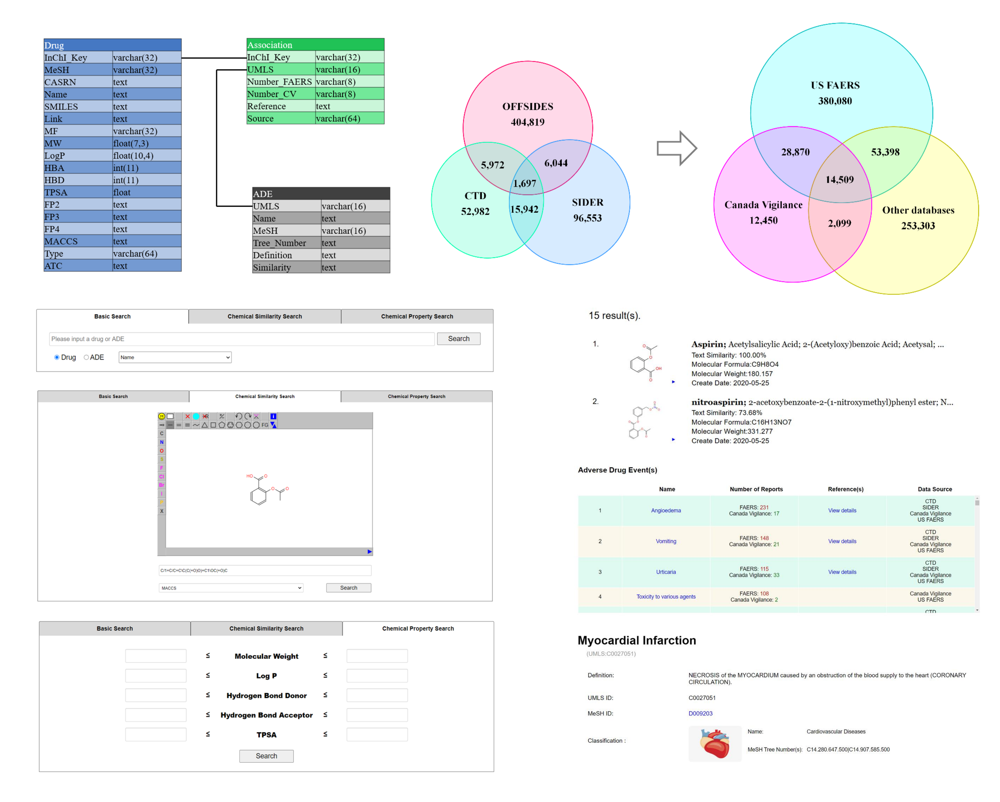 Basic Search module enables rapid, tri-axial interrogation of the knowledgebase. Users can retrieve curated records by pharmacological entity, by ADE, or by molecular target protein, thereby linking chemical structure, clinical phenotype, and mechanistic biology within a single query.